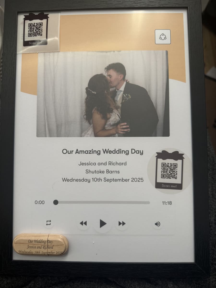 We keep it simple so you can enjoy the moment: our team delivers the Gold Audio Guest Book, sets it up, and shows a couple how it works. Guests pick up the phone, hear your personalised message (if chosen), and record their memories. After the event, we edit and compile everything into a polished MP3 with a scannable QR code and pair it with your framed photo. Done—memories preserved. β