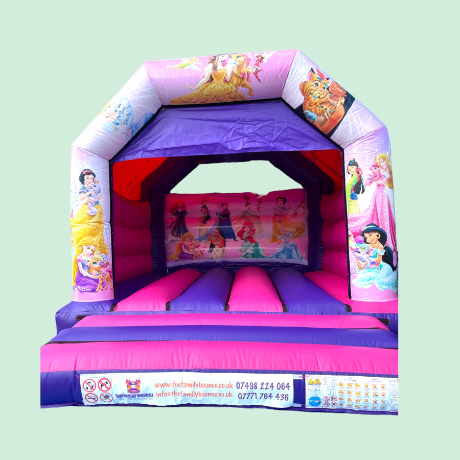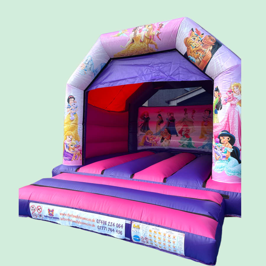 Then look no further than out lovely and bright Pink and Purple bouncy castle with beautiful Princess on either side of the castle and lovely flowers and all your woodland animals, big enough for all your little Prince and Princess to have fun on at the party.