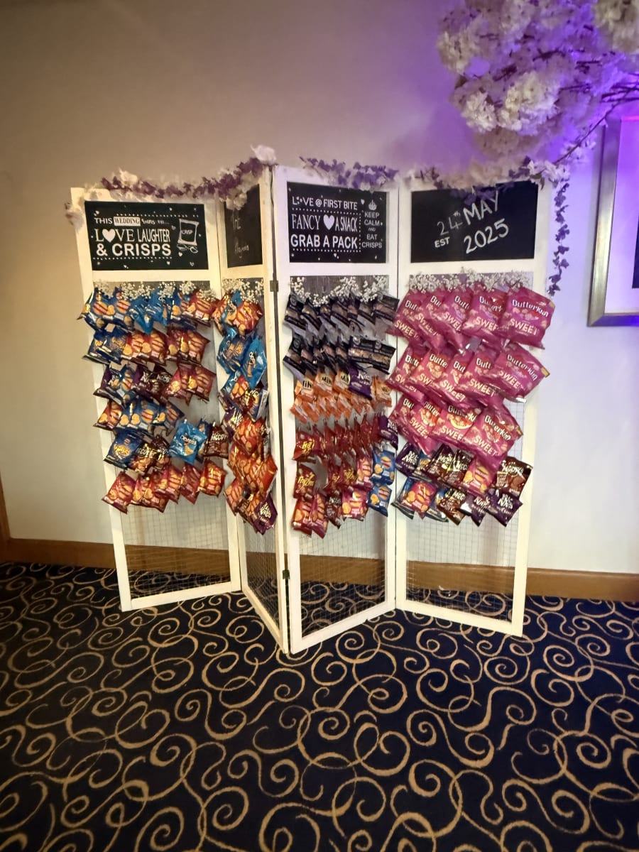 For £180.00 you get hire of the crisps wall with a selection of up to 150 packets of crisps or nuts. We’ll deliver and set up at a time that suits you, and our staff will be on hand to ensure everything looks great and runs smoothly. Any crisps left over at the end of the event will be left for you to take home — no waste, just smiles. πŸ₯”❀️