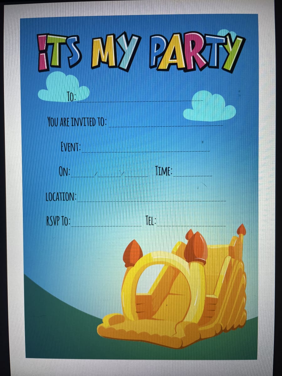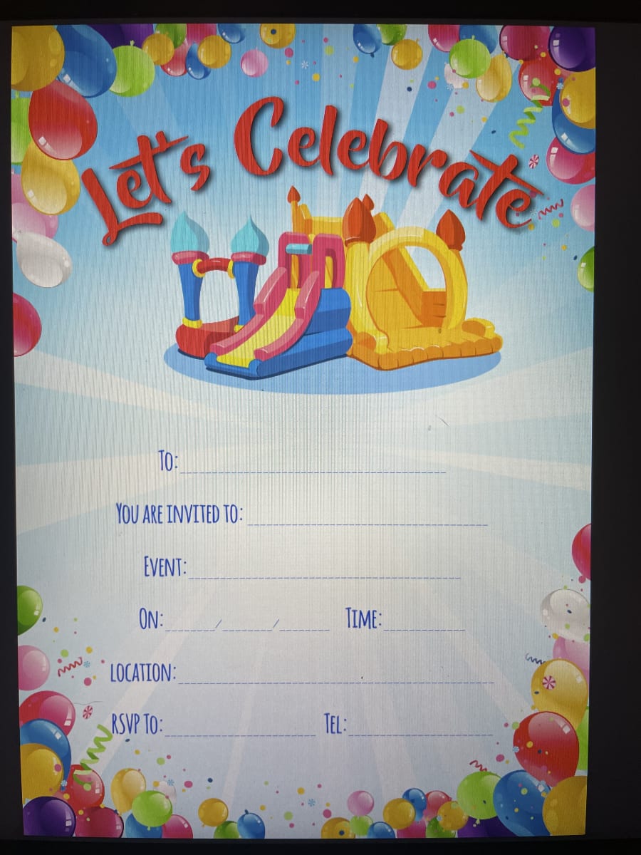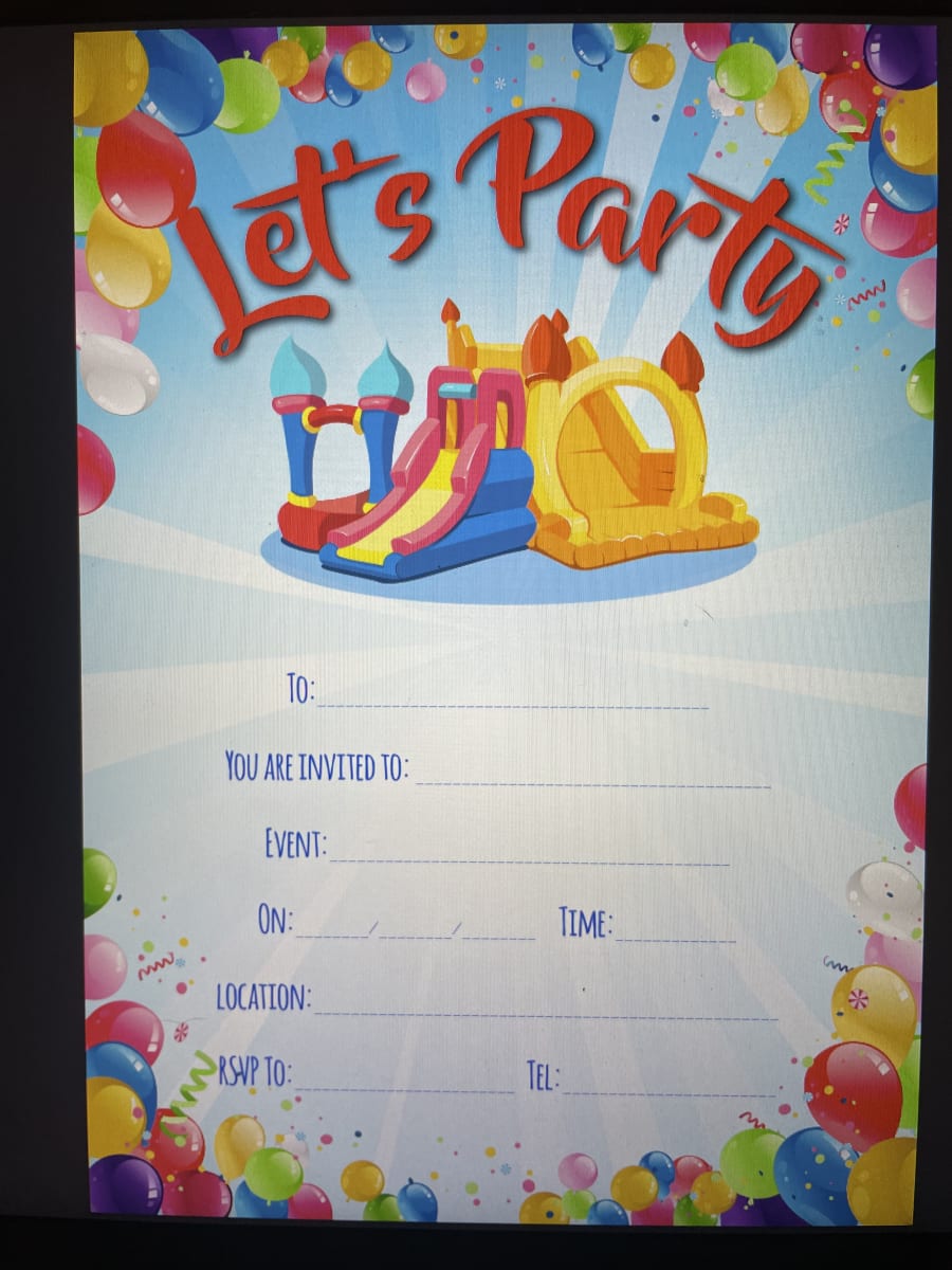 This lovely bright bouncy castle themed invites has been designed for you to be able to print off and use and send to all your lovely guests